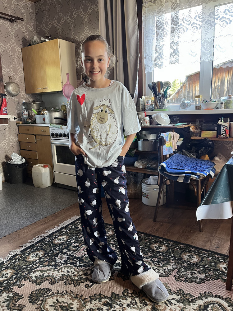 Ребёнок довольна пижамой.